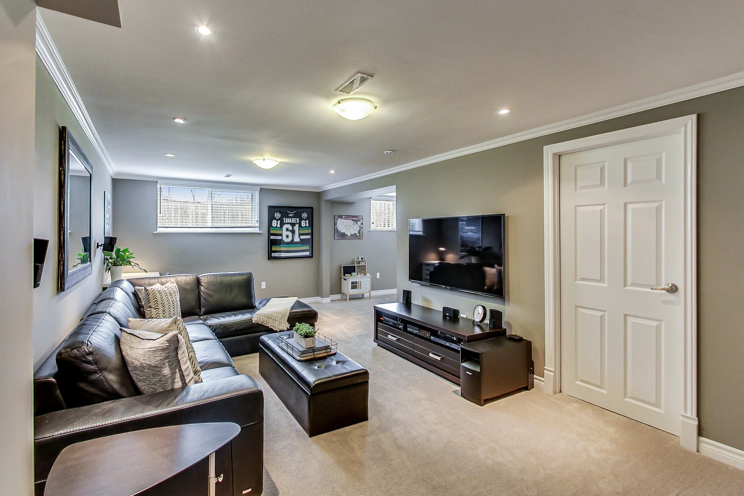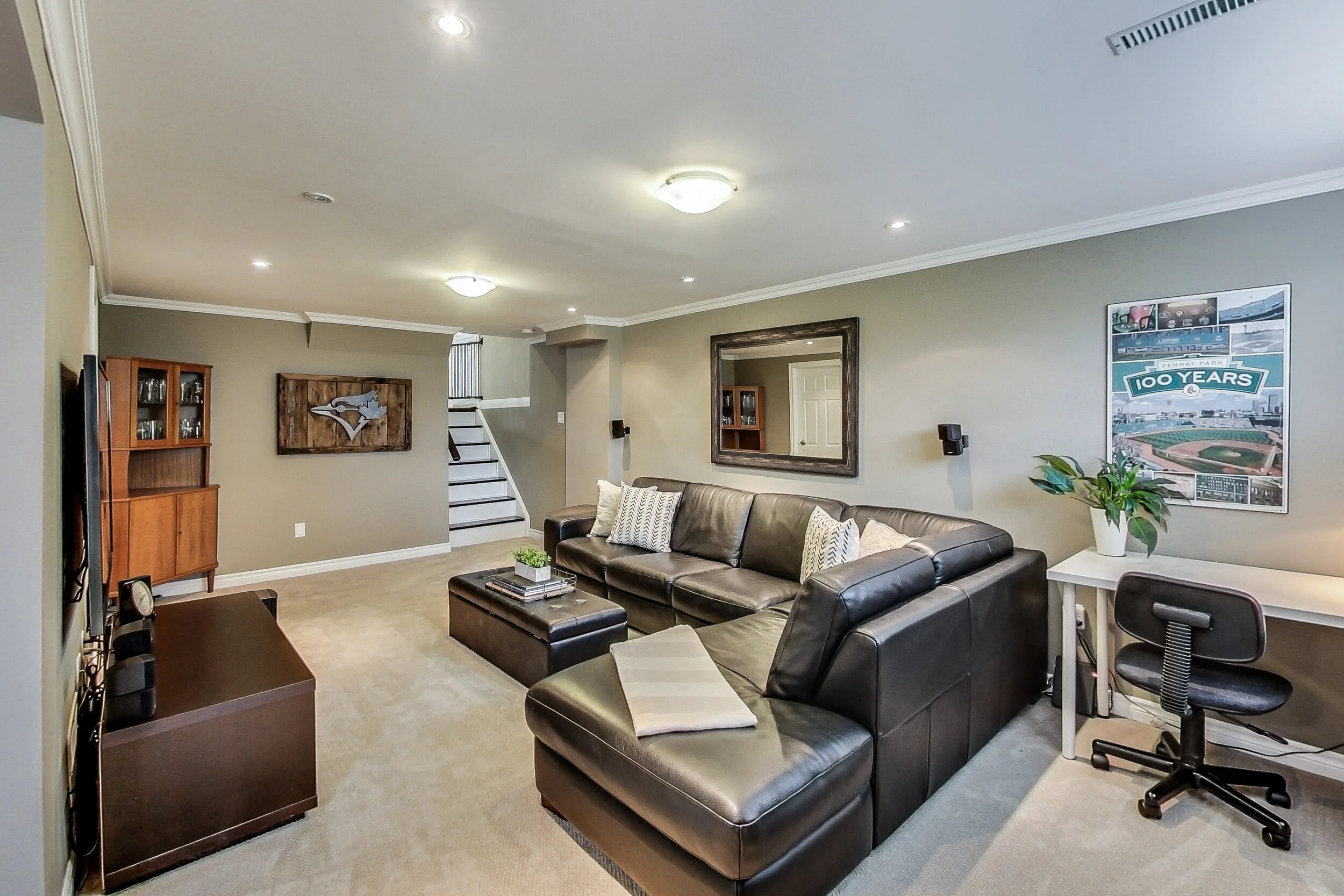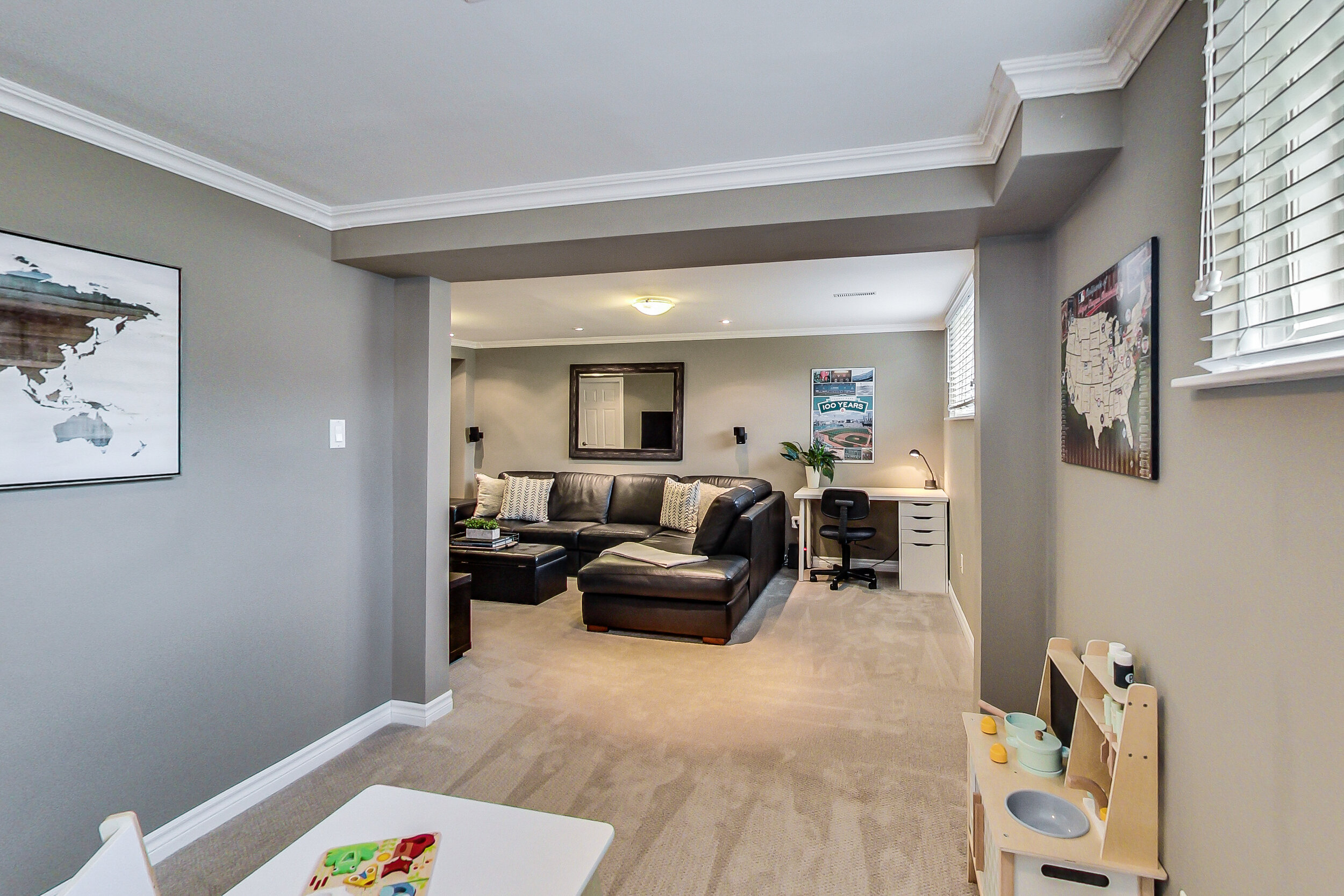 Oak stairs with modern iron wrought spindles separate both levels and lead to a finished lower level, which lends to the perfect extension of your living room. Suited for a growing family with plenty of natural light, a separate office space, pot lights, custom built-in storage, and a laundry room with an ample amount of additional storage.